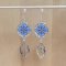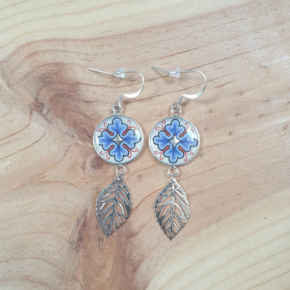 Ces boucles d'oreille ornées d'une enluminure à dominante bleue sont agrémentées d'une légère feuille filigranée plaquée argent fin.